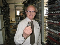 Tony Sale am Nachbau des COLOSSUS Rechners (2005). Tony Sale mit einer Radioröhre, wie sie im Colossus Rechner eingebaut wurden.