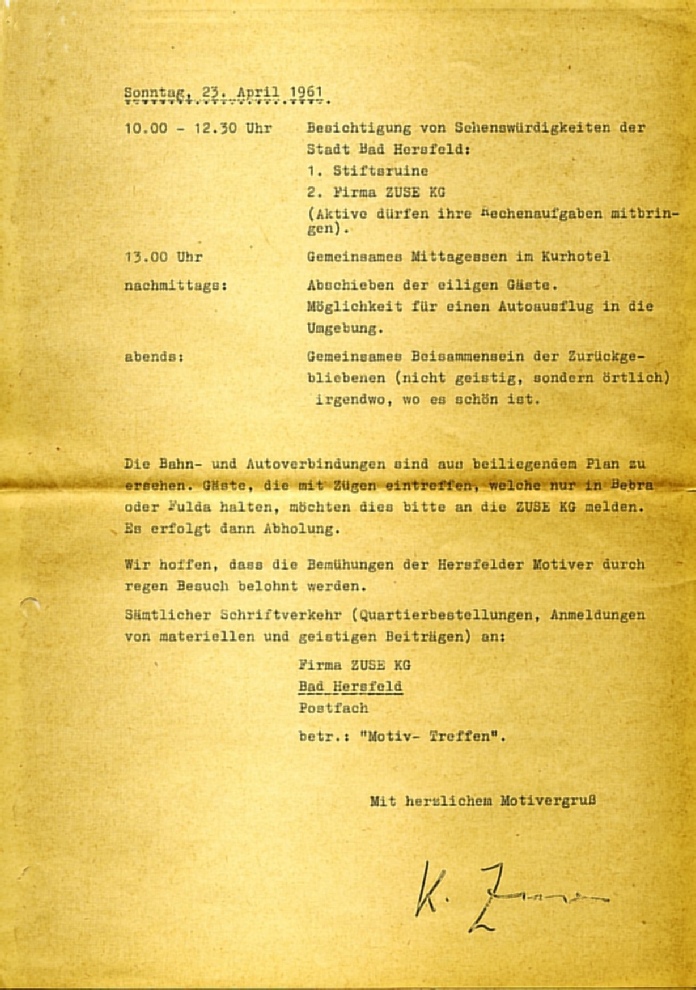 Ganz lustig ist die Einladung zum Stiftungsfest durch Konrad Zuse im Jahr 1961.
