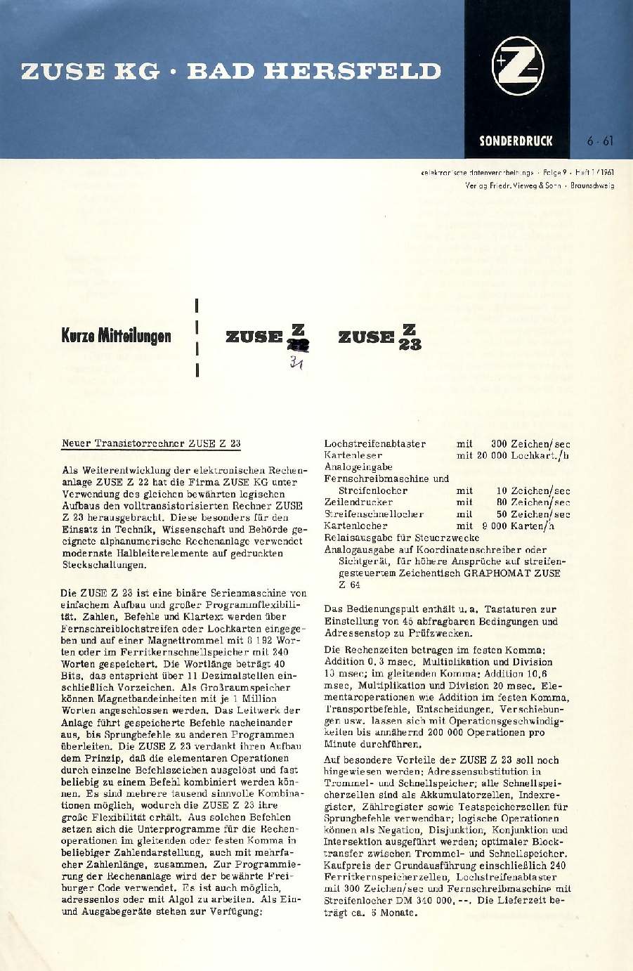 Die Mitteilung unten bschreibt die Z23 und Z31 der Zuse KG im Jahr 1961.