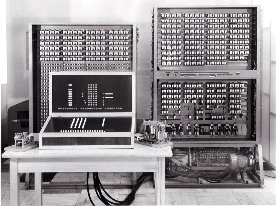Das Gestell links hinten enthält den Speicher für 32 Worte zu je 22 Bits. Das Gestell