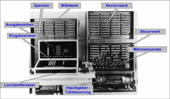 Konrad Zuses Z3 mit den Komponenten Speicher, Wählwerk Rechenwerk, Ein-